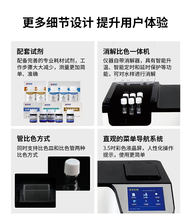 3.自帶消解器:儀器自帶消解器,具有智能升溫、智能定時和延時保護等功能,可對水樣進行消解;